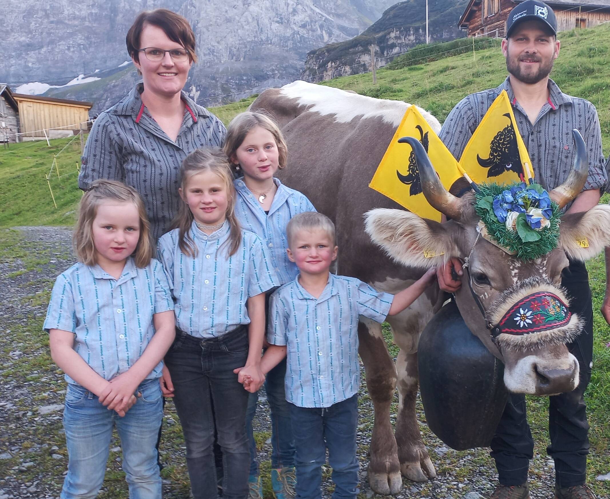 Das Betriebsleiterpaar (*1989, *1991) mit den vier Kindern (*2016, *2018, *2019, *2022) haben mit dem zweistufigen Alpbetrieb und mit der Bewirtschaftung des «Talbetriebs», welcher ca. 20 Fahrminuten entfernt liegt, alle Hände voll zu tun. Zur Milchwirtschaft und Aufzucht gehören Kühe, Rinder und Kälber, welche der Original Braunviehrasse angehören.