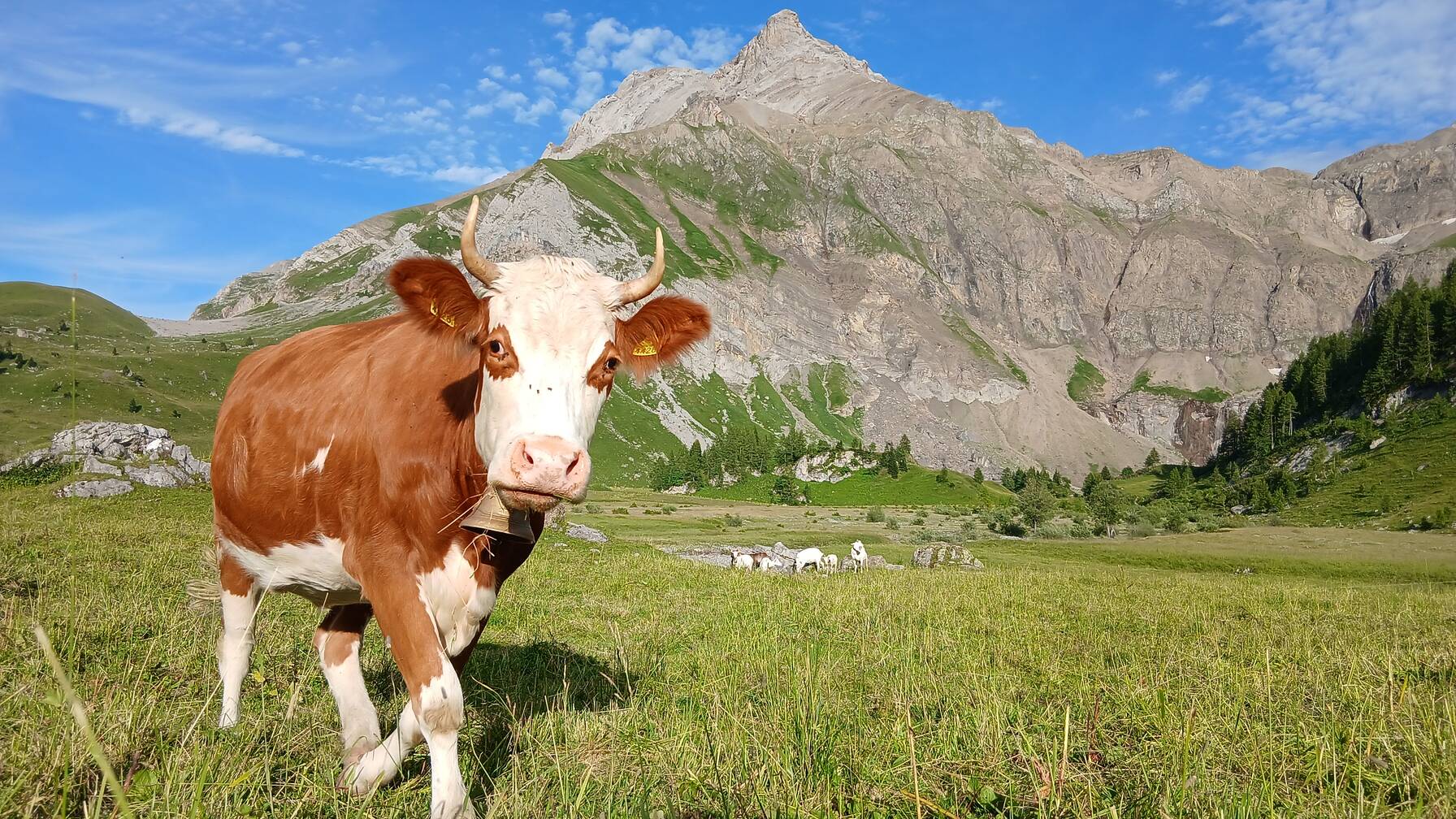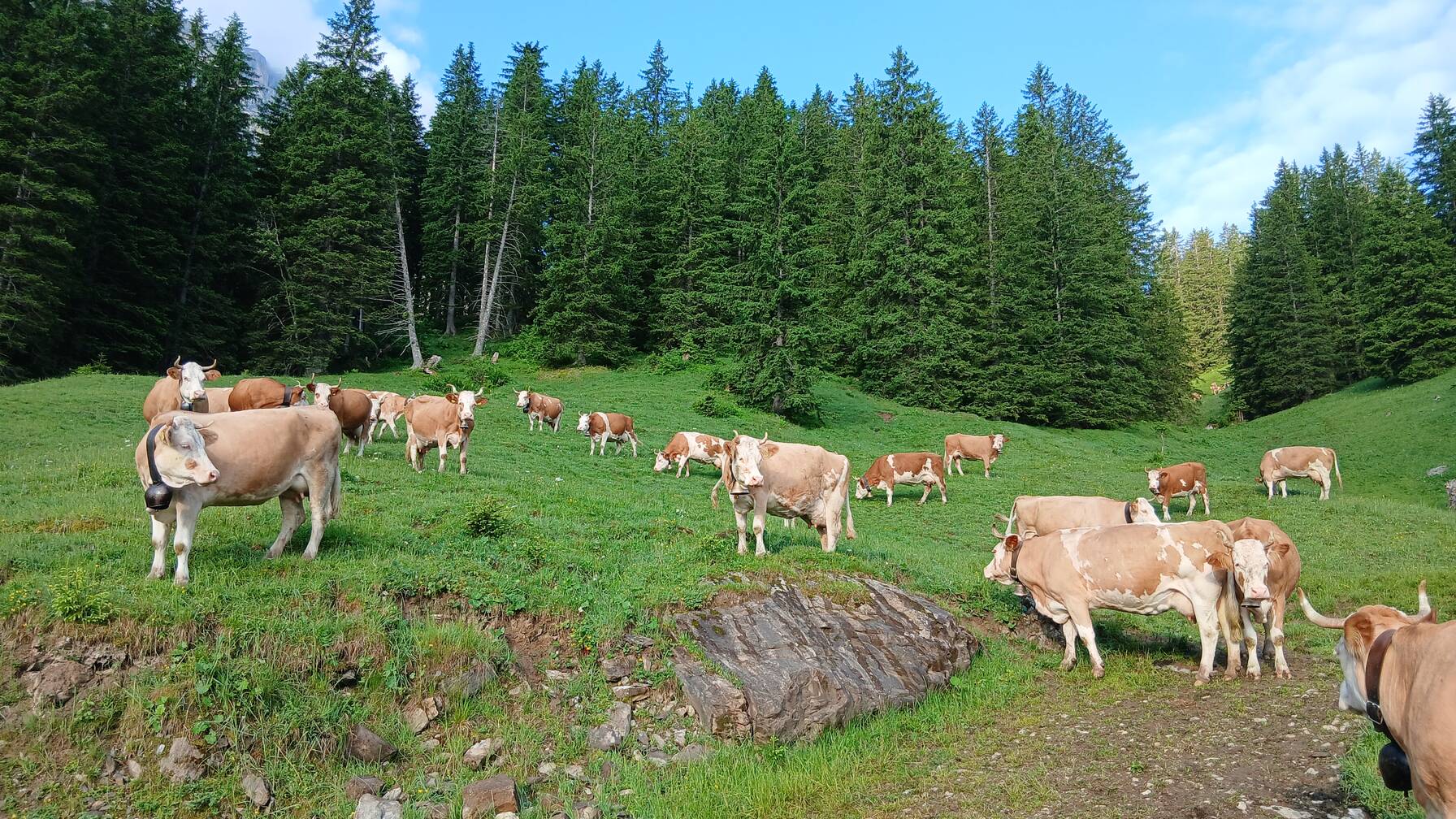 Kühe, Rinder, Kälber, Alpschweine und fünf Ziegen werden auf dem Talbetrieb auf 1'300 m ü. M. gehalten. Normalerweise ziehen die Mehrheit der Tiere und die Familie ab Mitte Mai zuerst auf eine Zwischenstufe, dann ab Juli auf die Alp. Hier werden herrlicher Berner Alpkäse AOC und Ziegenkäse hergestellt, die direkt vermarket werden.
