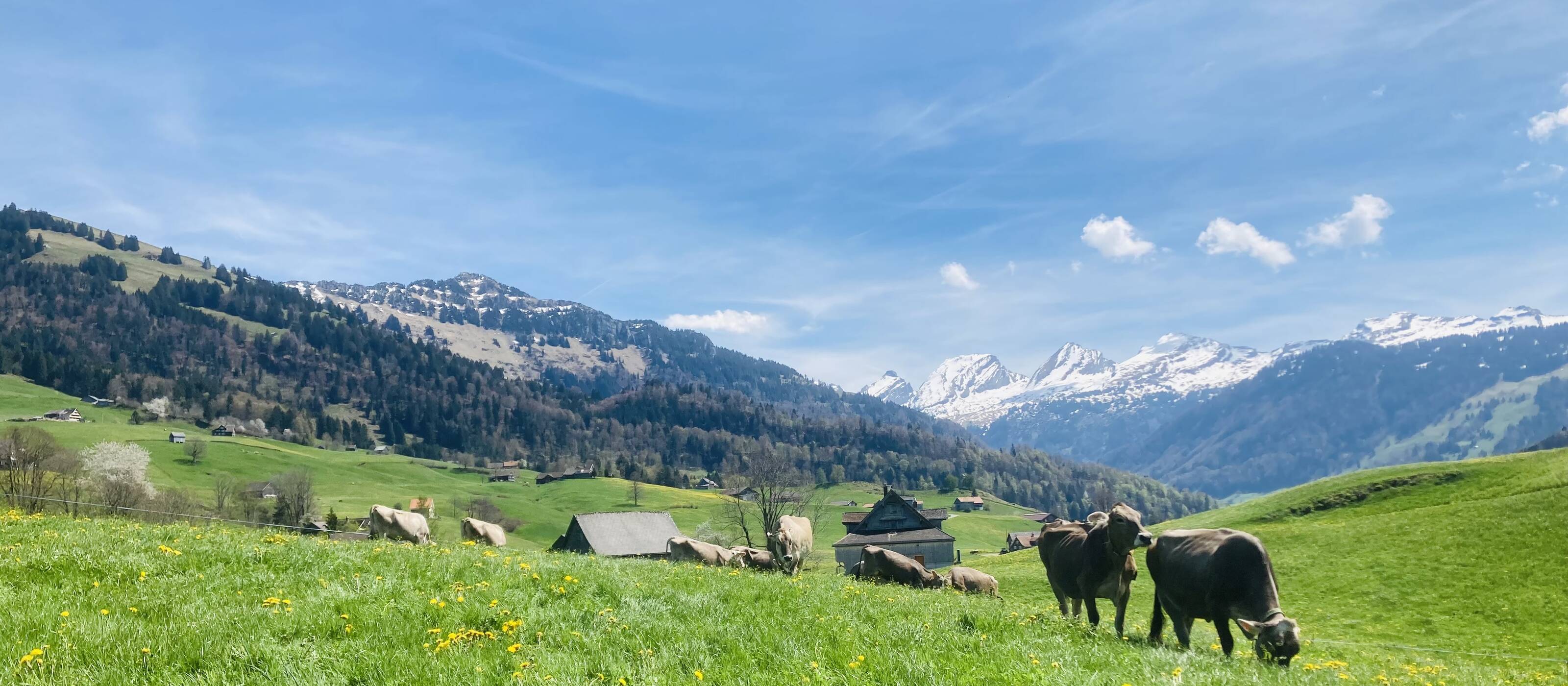 An einem Südhang im oberen Toggenburg befindet sich dieser Hof auf 900 m ü. M. in der Bergzone II. Die Gegend ist hier geprägt durch die landwirtschaftlichen Streusiedlungen. Die 4-köpfige Familie (*1992, *1987, *2014, *2022) betreibt hier mit Kühen, Kälbern und Rindern Milchwirtschaft und Aufzucht. Auch einige Hühner und Ziegen gehören zur Entourage.